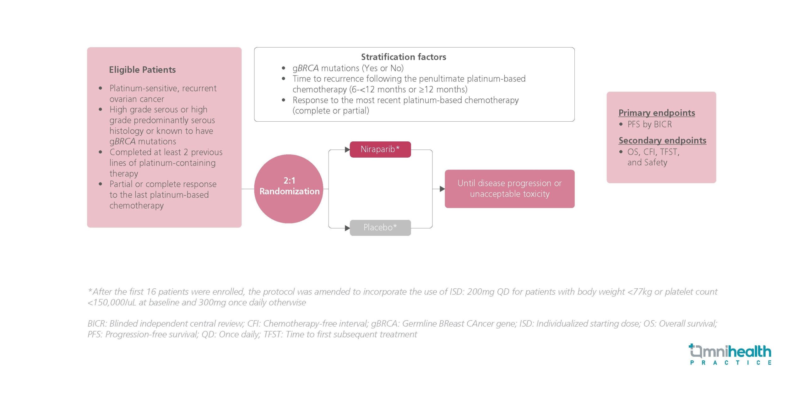Niraparib is a potent and highly selective poly-ADP ribose polymerase (PARP) inhibitor.1 PARP inhibitors have shown a trend of favorable overall survival (OS) in platinum-sensitive recurrent ovarian cancer (PSROC) in the maintenance setting.1 However, this OS benefit appears inconsistent in patients without BReast CAncer gene (BRCA) mutations which has been attributed to confounding factors, such as post-progression therapies.1
