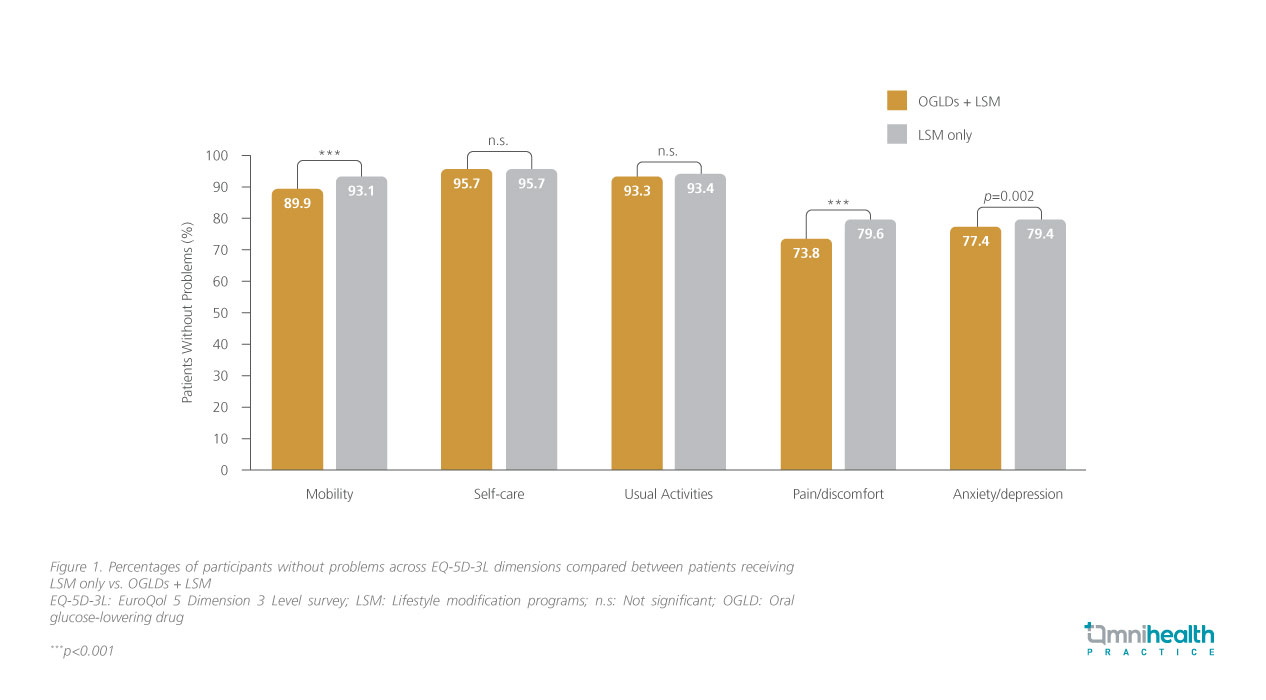 In this analysis, treatment modalities were also associated with EQ- 5D-3L scores.12 A total of 5,082 patients received LSM only, while the majority (n=42,813) had both OGLDs and LSM.12 Patients who received LSM only had a higher index score (0.910 vs. 0.896; p<0.001) with more participants having a high EQ-5D-3L score (64.5% vs. 60.6%; p<0.001).12 More patients treated with LSM reported “no problem” in the mobility (p<0.001), pain/discomfort (p<0.001) and anxiety/depression (p=0.002) categories than patients treated with OGLDs (figure 1).12