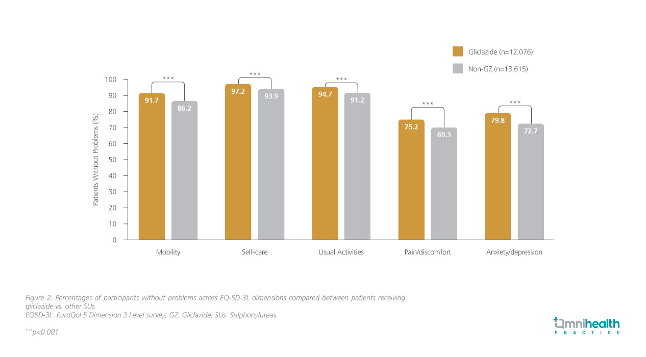 Among those treated with OGLDs, 60% (n=25,693) received sulphonylureas (SUs), of whom 47% (n=12,078) had received gliclazide. Compared to non-SU users, SU users had lower index scores (0.889 vs. 0.907; p<0.001) with a lower proportion having a high EQ-5D-3L score (58.7% vs. 63.4%; p<0.001).12 However, among the users of SUs, more patients treated with gliclazide reported “no problem” in all dimensions (p<0.001) than non-gliclazide users (figure 2).12 Despite their older age and higher prevalence of cardiovascular and renal comorbidities, gliclazide users had higher index scores (0.903 vs. 0.877; p<0.001) and were more likely to have high EQ-5D-3L score (62.9% vs. 55.0%; p<0.001) than non-gliclazide users.12 This difference was attributed to their better control of HbA1c, lipid and blood pressure without an increased risk of hypoglycemia.12,13