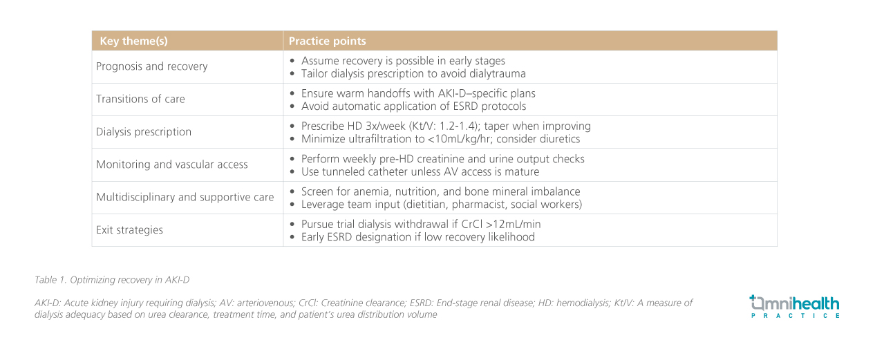 With increasing recognition that many AKI-D patients can recover kidney function, this guidance urges clinicians to shift away from ESRD protocols and adopt AKI-specific pathways.1 The following table outlines summary practice points to inform safe and effective outpatient management for this population (table 1).1
