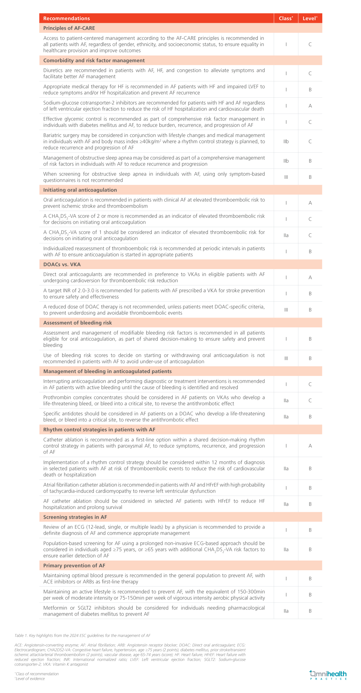 The 2024 ESC Guidelines for the management of AF were developed in collaboration with the European Association for Cardio-Thoracic Surgery (EACTS).4 At the recent 2024 ESC Congress, Professor Isabelle C. Van Gelder from the University Medical Centre Groningen in the Netherlands, and Professor Dipak Kotecha from the University of Birmingham in the United Kingdom, shared the key recommendation updates (table 1).5