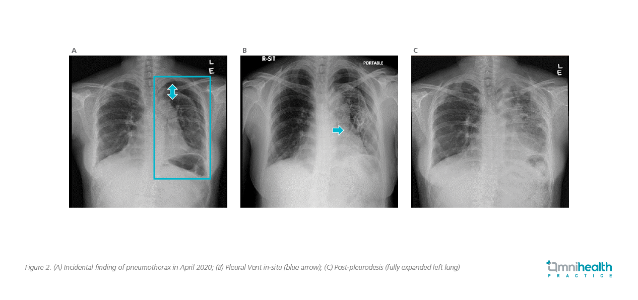 Dr. Lui shared a case to demonstrate the clinical effectiveness of ambulatory device in the management of selected patients with SP. A non-smoking female patient in her thirties had a past medical history of haematological malignancy and autologous stem cell transplant 10 years ago. She was diagnosed with pleuroparenchymal fibroelastosis 5 years after the transplant. In a follow-up visit, she was found to have a left sided apical pneumothorax (3cm from apex, figure 2A). Due to her underlying lung disease, a diagnosis of secondary SP was made. The patient did not experience any significant worsening in breathlessness and had a peripheral arterial oxygen saturation (SpO2) of 97% on room air. However, in view of her underlying chronic lung disease with fair lung function reserve, she was admitted to hospital for further monitoring.