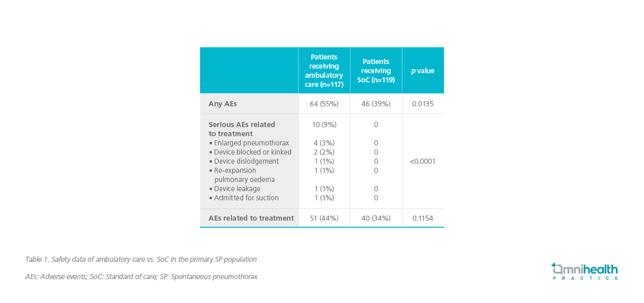 Chest drainage connected to traditional underwater seal system is associated with median length of hospital stay (LoS) of at least 6-8 days.3 According to an open-label, randomized controlled trial published in 2020, the use of ambulatory devices (i.e. Pleural Vent) greatly reduced the LoS.3 In this study, 236 adults with symptomatic primary SP were randomized 1:1 into standard of care (SoC) treatment or Pleural Vent management.3 The SoC arm had adhered to the BTS guidelines where aspiration was employed with optional smallbore chest drainage at the discretion of the physicians.3 Patients in the Pleural Vent arm were discharged soon after placement of the ambulatory device if they were clinically stable and mobile.3 The primary outcome of the study was to evaluate the total LoS, including readmissions within the first 30 days.3 Patients who had been discharged on the same day were recorded as having 0 day.3 It was shown that the use of ambulatory devices significantly reduced the median LoS from 4 days to 0 day (p<0.0001).3 In the meantime, the rate of AEs was reported to be higher with the ambulatory treatment group on account of home management.3 Below is a summary of the safety data from the trial (table 1):3
