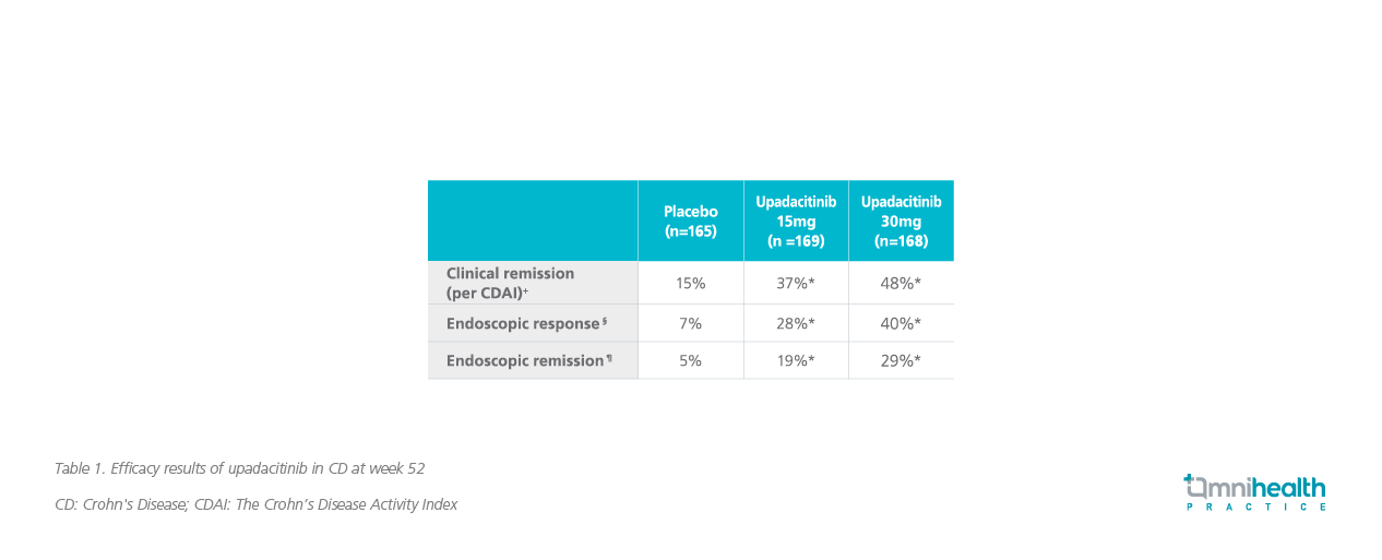 - Upadacitinib achieved clinical remission and endoscopic response at 1 year in phase 3 maintenance study in patients with CD. Abbvie. https://news.abbvie.com/news/press-releases/upadacitinib-rinvoq-achieved-clinical-remission-and-endoscopic-response-at-one-year-in-phase-3-maintenance-study-in-patients-withcrohns- disease.html. Accessed July 31, 2022.