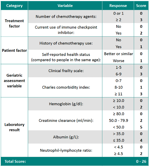 In conclusion, this local study developed and validated a TRT prediction tool for older cancer patients receiving systemic treatment, incorporating patient characteristics, treatment factors, geriatric assessment results, and laboratory data.1 The model offers clinicians a practical tool to estimate TRT risk, supporting treatment decision-making in older adults with cancer.1
