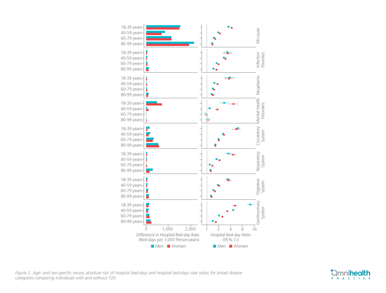 Compared to their healthy counterparts, men and women with T2D had a 1.75-fold (95% CI: 1.73-1.76; p<0.001) and 1.87-fold (95% CI: 1.85-1.89; p<0.001) increased risk of all-cause hospital bed-day rate, respectively.1 T2D was associated with the greatest risk of hospital bed-days rate due to genitourinary system diagnoses in both male and female T2D patients when compared to the healthy controls (rate ratio [RR] in men=2.94; 95% CI: 2.86-3.01, RR in women=2.64; 95% CI: 2.57-2.71) (figure 1).1 Similarly, both male and female T2D patients were also twice as likely to have an increased hospital bed-day rate due to infections (RR in men=2.11; 95% CI: 2.04-2.18, RR in women=2.30; 95% CI: 2.23-2.38) and complications in the circulatory system (RR in men=2.27; 95% CI: 2.23-2.32, RR in women=2.25; 95% CI: 2.20-2.30) compared to their healthy counterparts.1