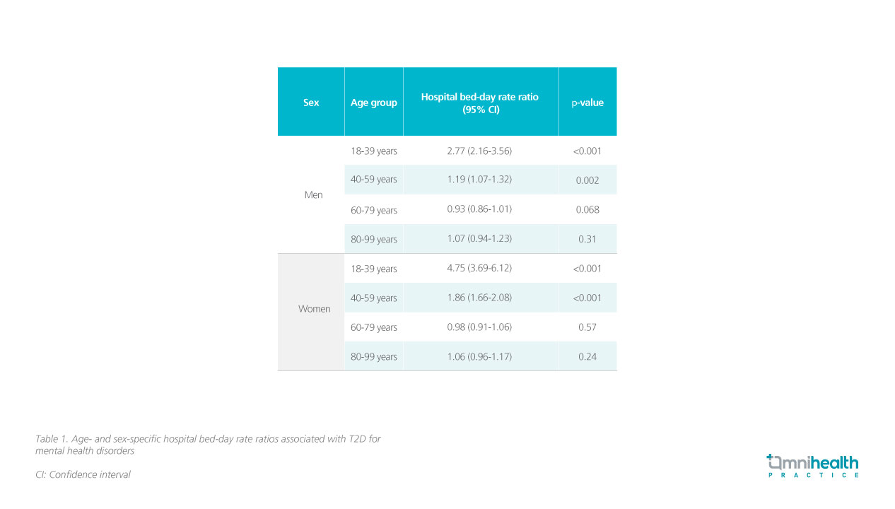 In this Hong Kong cohort study, mental health disorders constituted an overall 38.4% of hospital bed-days in young-onset T2D patients (age 18-39).1 Male young-onset T2D patients had a 2.77-fold increased risk of hospital bed-day due to mental health disorders compared to healthy controls (RR=2.77; 95% CI: 2.16-3.56; p<0.001), whereas female young-onset T2D patients experienced roughly a 4.75-fold increased risk of hospital bed-day for mental health disorders compared to their healthy counterparts (RR=4.75; 95% CI: 3.69-6.12; p<0.001) (figure 1 & table 1).1,4 Conversely, mental health disorders did not significantly impact the hospital bed-day rates of T2D patients in the “60-79 years” and “80-99 years” age groups (table 1).4