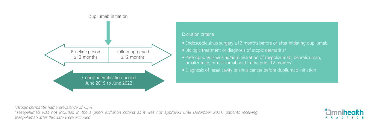 This was a retrospective observational cohort study of adult patients with CRSwNP who initiated dupilumab 300mg every two weeks between June 2019 and June 2022.1 OCS and antibiotic use data were drawn from the OM1 Real-World Data Cloud and the Reg-ENTSM Registry.1 Patients were excluded if they had had endoscopic sinus surgery within 12 months before or after dupilumab initiation, prior biologic treatments, or diagnoses of atopic dermatitis.1 Patients prescribed, dispensed, or administered with, mepolizumab, benralizumab, omalizumab, or reslizumab within the previous 12 months, or diagnosed with nasal cavity or sinus malignancy before dupilumab initiation, were also excluded.1 The cohort included 1,016 patients, of whom 724 (71.3%) had a history of allergic rhinitis, and 579 (57.0%) had a history of asthma.1