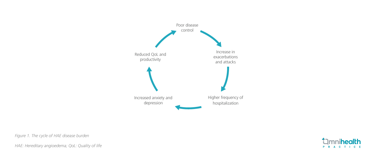 HAE attacks pose a significant burden on patients’ mental health and overall QoL.3-5 A multinational survey conducted in 2018 reported a considerable number of HAE patients had moderate-to-severe anxiety (38.0%) and depression (17.4%).3 Mental health impairments reinforce a vicious cycle of poor QoL which worsens HAE control, further increasing the frequency of attacks and hospitalization (figure 1).4 A US-based patient survey reported that up to 67.0% of HAE patients who experienced high attack rates (≥13 attacks in 6 months) believed that HAE had considerably hindered their ability to accomplish even basic daily activities.5