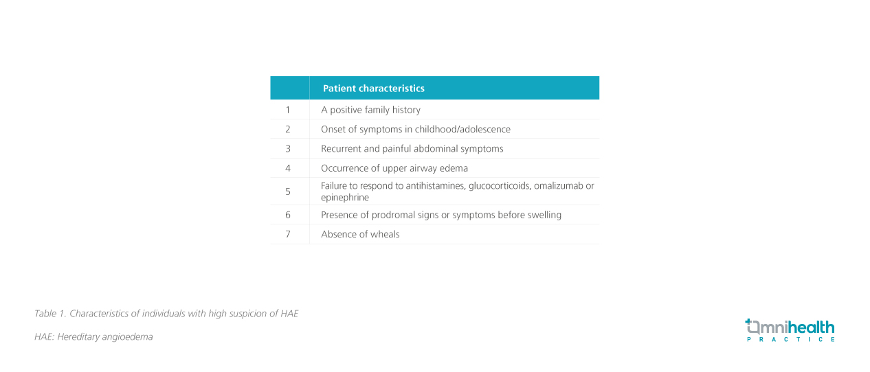 Timely diagnosis and intervention are critical factors in optimizing the clinical outcomes of HAE patients.2 According to the WAO/EAACI guideline, if a patient presents with a history of recurrent swelling of the skin (extremities, face and genitals), gastrointestinal attacks (abdominal cramps and/or laryngeal edema) and reports certain characteristics (table 1), laboratory assessments of serum/plasma levels of C1-INH function, C1-INH protein, and C4 should be performed to confirm the diagnosis of HAE-1/2.2