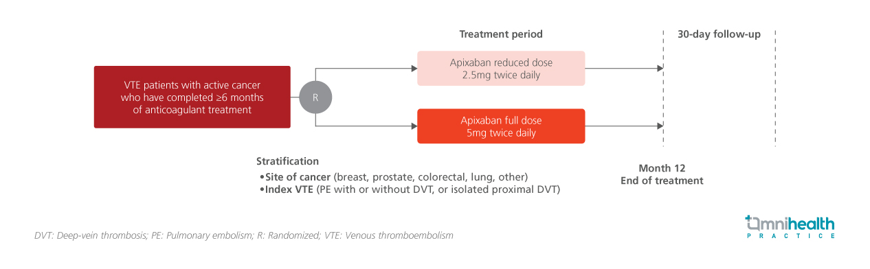 International guidelines recommend maintaining anticoagulation for cancer-associated thrombosis for the duration of active malignancy or ongoing cancer therapy.1 As the risk of recurrent venous thromboembolism (VTE) decreases over time while bleeding risk remains substantial, reduced-dose apixaban was hypothesized to have non-inferior efficacy and improved safety compared to the full-dose therapy for extended VTE treatment.1