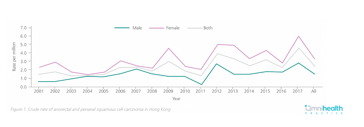 Anal cancer is relatively uncommon in the general population of Hong Kong. However, specific populations face a higher risk of developing anal cancer such as people living with human immunodeficiency virus HIV (PLHIV), men who have sex with men (MSM), transgender women, and individuals with a weakened immune system (e.g. solid organ transplant recipients and patients with autoimmune disorders who are treated with immunosuppressants). According to statistics from the Hong Kong Cancer Registry, the incidence rate of anal cancer has also been consistently higher in women compared to men (figure 1 and table 1), which may be attributed to cervical and vulvar cancer being closely associated with anal cancer.