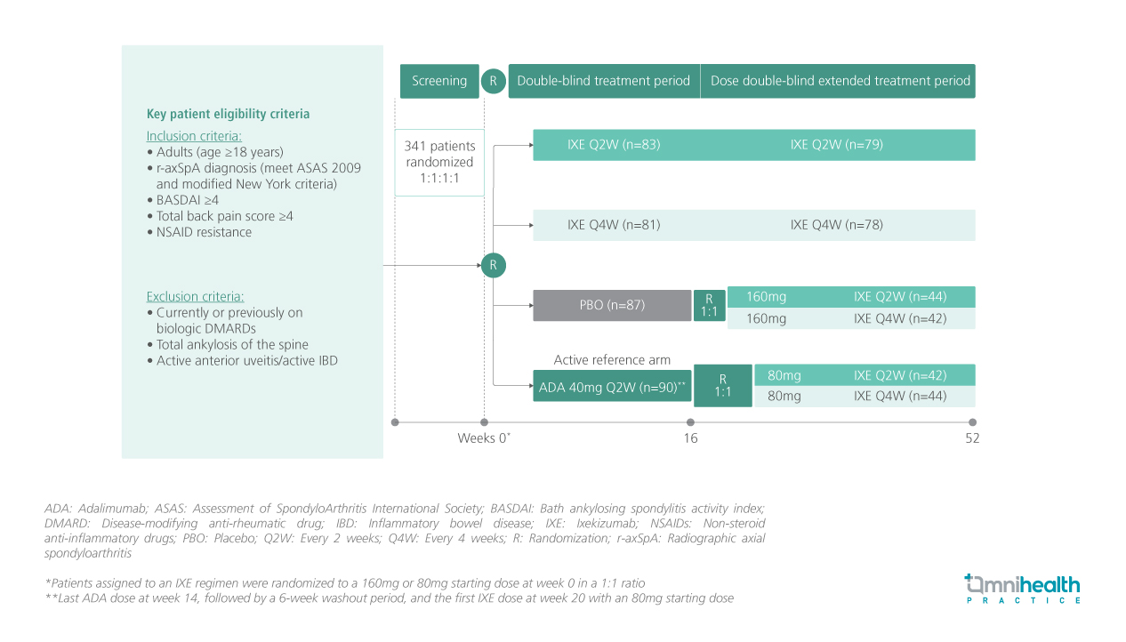 COAST-V is a 52-week phase 3, multicenter, randomized, double-blind, placebo (PBO)-controlled and active-controlled trial involving bio-naïve adult patients with active r-axSpA (n=341).1 They were randomized 1:1:1:1 to receive PBO, 80mg subcutaneous IXE every 2 weeks (Q2W), IXE every 4 weeks (Q4W), or 40mg adalimumab (ADA) Q2W as an active reference.1 In week 16, patients in the PBO and ADA groups were randomized 1:1 again to receive IXE Q2W or Q4W.1