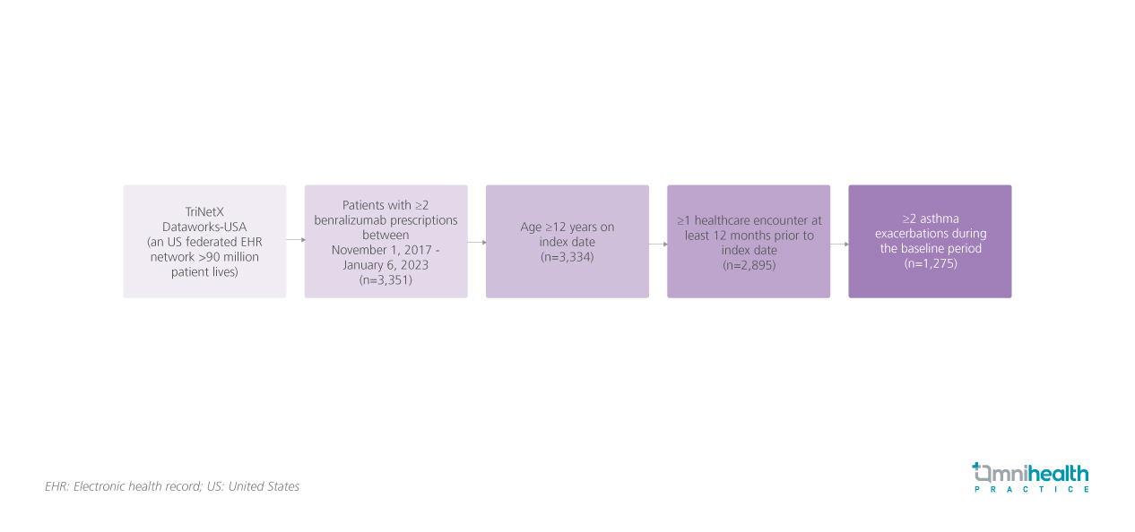 The ZEPHYR-4 study was a retrospective observational study using data from the US federated electronic health record (EHR) describing the clinical outcomes in patients with benralizumab in real-world US practice.1 The study included 2,895 patients aged ≥12 years who had received ≥2 benralizumab prescriptions and had ≥1 healthcare encounter in the previous 12 months.1 A subgroup of patients who have had ≥2 exacerbations (n=1,275) within the 12-month baseline period was also defined and analyzed separately.1