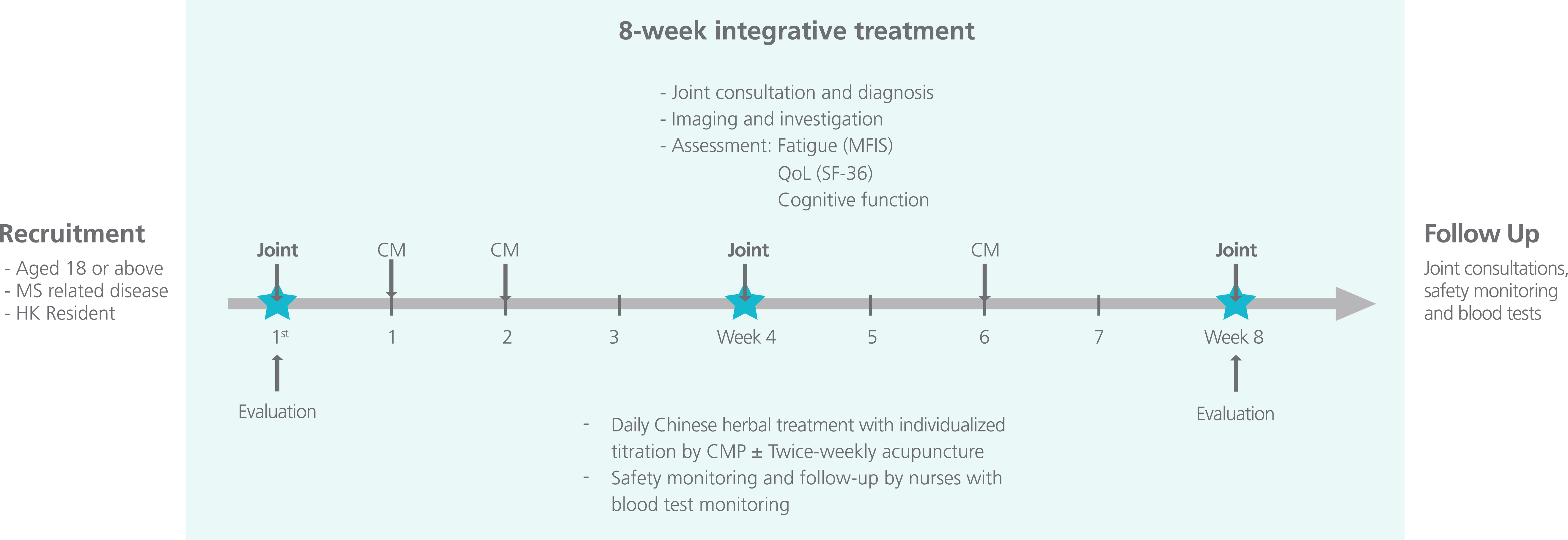 Under this program, MS patients received an 8-week integrative, semi-structured medicine approach where they were jointly managed by neurologists, CMPs and nurses at the HKIIM clinic (Figure 1).8,9 In addition to the standard-of-care pharmacotherapy backbone, patients were assessed by CMPs at the beginning of each week and received CHM and/or acupuncture as prescribed.8 Clinical toxicologists assessed the potential herb-drug interactions of the integrative approach and monitored the safety signals of those patients.8 All patients who completed the 8-week integrative program or discontinued the treatment would return to the standard-of-care management for MS.