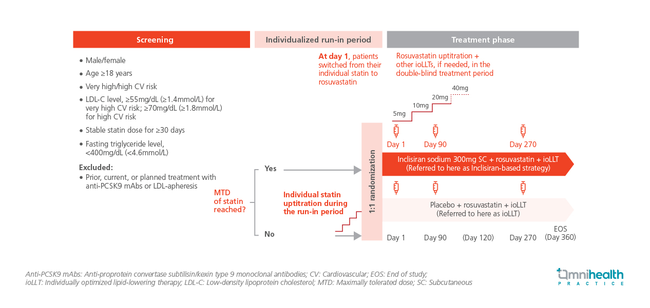 This phase 4, double-blind, placebo-controlled study enrolled a total of 1,770 patients across 133 sites in 8 European countries.1 Prior to randomization, patients underwent a statin run-in period during which they were switched to rosuvastatin and up-titrated to MTD if guideline-recommended LDL-C levels were not attained.1 Eligible patients were ≥18 years old with high or very high CV risk, with fasting triglyceride level <400mg/dL and on a stable statin dose for ≥30 days.1 At randomization, participants were assigned 1:1 to either inclisiran sodium 300mg subcutaneous (SC) injection + rosuvastatin + ioLLT (inclisiran-based strategy) or placebo + rosuvastatin + ioLLT (ioLLT strategy).1 Baseline demographics and clinical characteristics were well-balanced between arms.1 Patients were followed up for 360 days with assessments at multiple timepoints.1