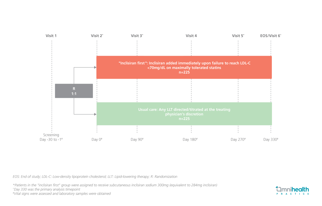 The primary endpoints of the study were the percent change in LDL-C from baseline to day 330 and the discontinuation of statin (defined as no statin use ≥30 days before the end-of-study visit).1 Key secondary endpoints included the proportion of patients achieving the pre-specified LDL-C goals at day 330 and changes in background lipid-lowering therapy (LLT).1 A safety analysis was also performed at each follow-up visit.1