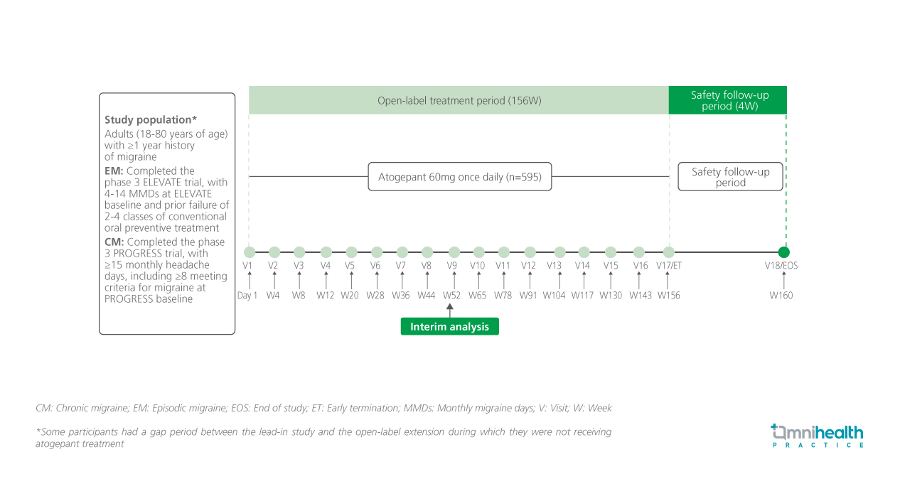 In the captioned, ongoing, multicenter, open-label long-term safety extension study (3101-312-002), atogepant 60mg once daily (QD) was given over a 156-week period for the preventive treatment of EM or CM.1 All 595 adult participants (18-80 years of age) with ≥1 year history of migraine had completed the trials (ELEVATE, n=270; PROGRESS, n=325).1 This interim analysis used efficacy data collected at week 52, including those who withdrew from the study, to evaluate the long-term safety, tolerability and efficacy in EM and CM prevention.1