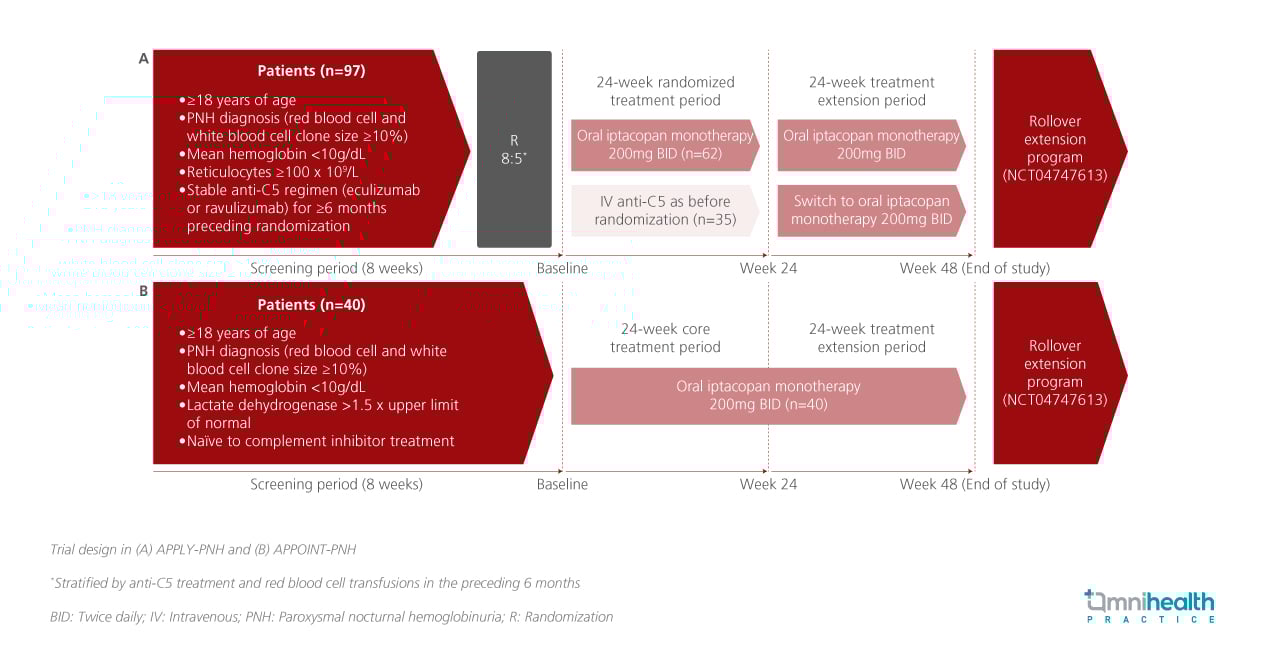 APPLY-PNH was an open-label, randomized, multicenter, phase 3 trial conducted in adult patients with PNH and mean hemoglobin (Hb) 1.5x the upper limit of normal, who received iptacopan (200mg twice daily, n=40) for 24 weeks.1 Patients in both trials, including those initially on anti-C5 therapy in APPLY-PNH, were allowed to continue iptacopan monotherapy for an additional 24 weeks, completing a total of 48 weeks of treatment.1