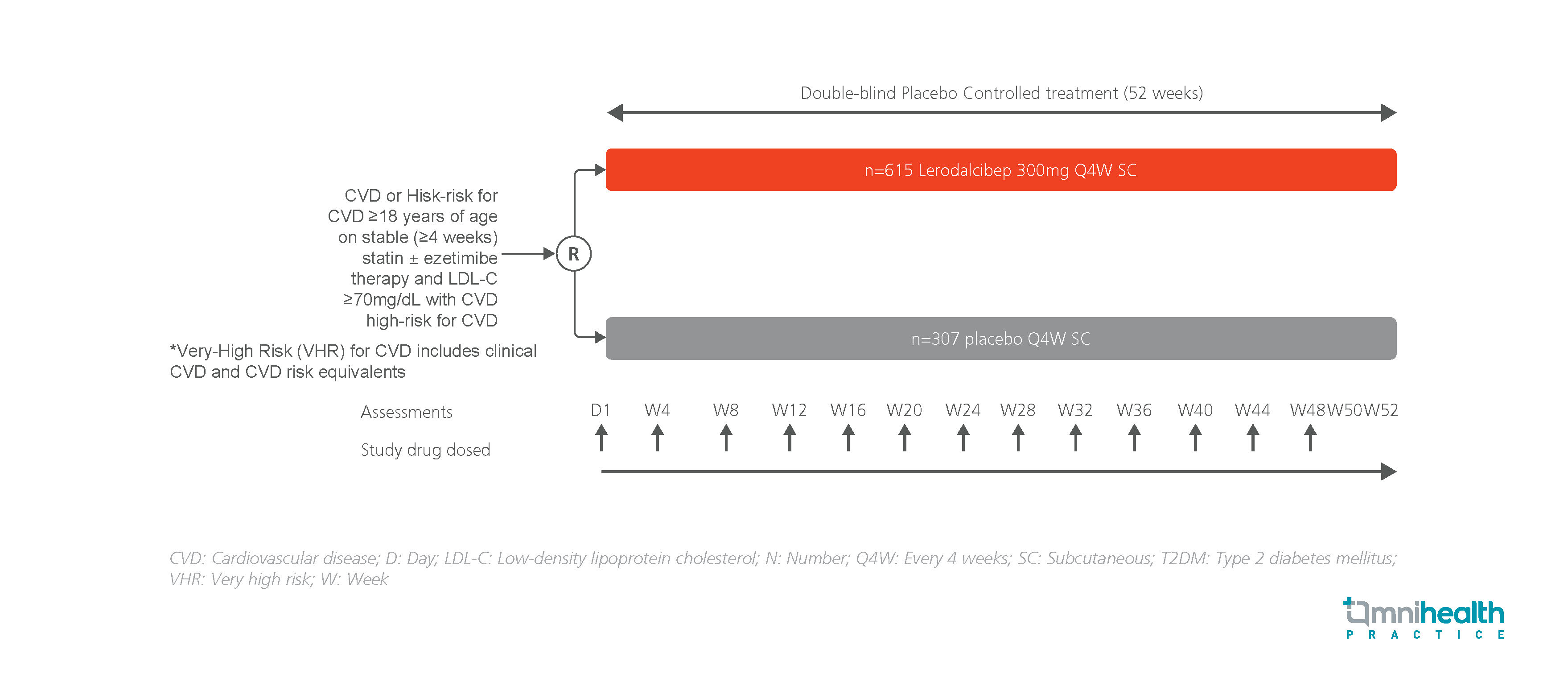 The LIBerate-HR is a phase 3 study conducted to assess the efficacy and safety of lerodalcibep in patients at very high or high risk for CVD.1 The study included 922 adult patients with cardiovascular disease (CVD) or at high risk for CVD, who were receiving stable doses of statin with or without ezetimibe and have LDL-C levels ≥70mg/dL and CVD or LDL-C levels ≥100mg/dL and a high risk of CVD.1 Patients with very high risk, including those with clinical CVD or CVD risk equivalents were also included.1 They were randomized (2:1) to receive monthly subcutaneous (SC) injections of lerodalcibep 300mg (n=615) or a matching placebo (n=307) for 52 weeks.1