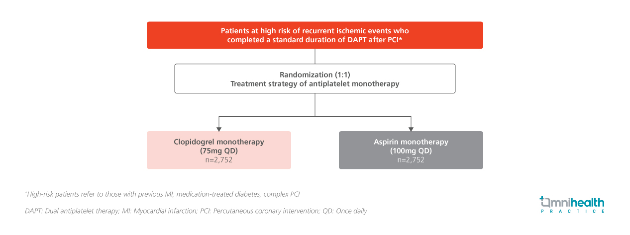 In the SMART-CHOICE 3 trial, a total of 5,506 patients (median age: 65 years) were randomized in a 1:1 ratio to receive either clopidogrel 75mg once daily (n=2,752) or aspirin 100mg once daily (n=2,754).1 Eligible participants were adults aged 19 years or older who had undergone successful PCI with drug-eluting stents (DES) and had completed a standard duration of DAPT—defined as at least 12 months following myocardial infarction (MI) or at least 6 months after PCI for other indications.1 To qualify as high risk for recurrent ischemic events, patients were required to have at least one clinical characteristic, such as a history of MI, medication-treated diabetes mellitus, or complex coronary artery lesions.1 The median interval between PCI and randomization was 17.5 months, and the median follow-up duration was 2.3 years.1 Baseline demographics and clinical characteristics were well-balanced between the two treatment groups.1