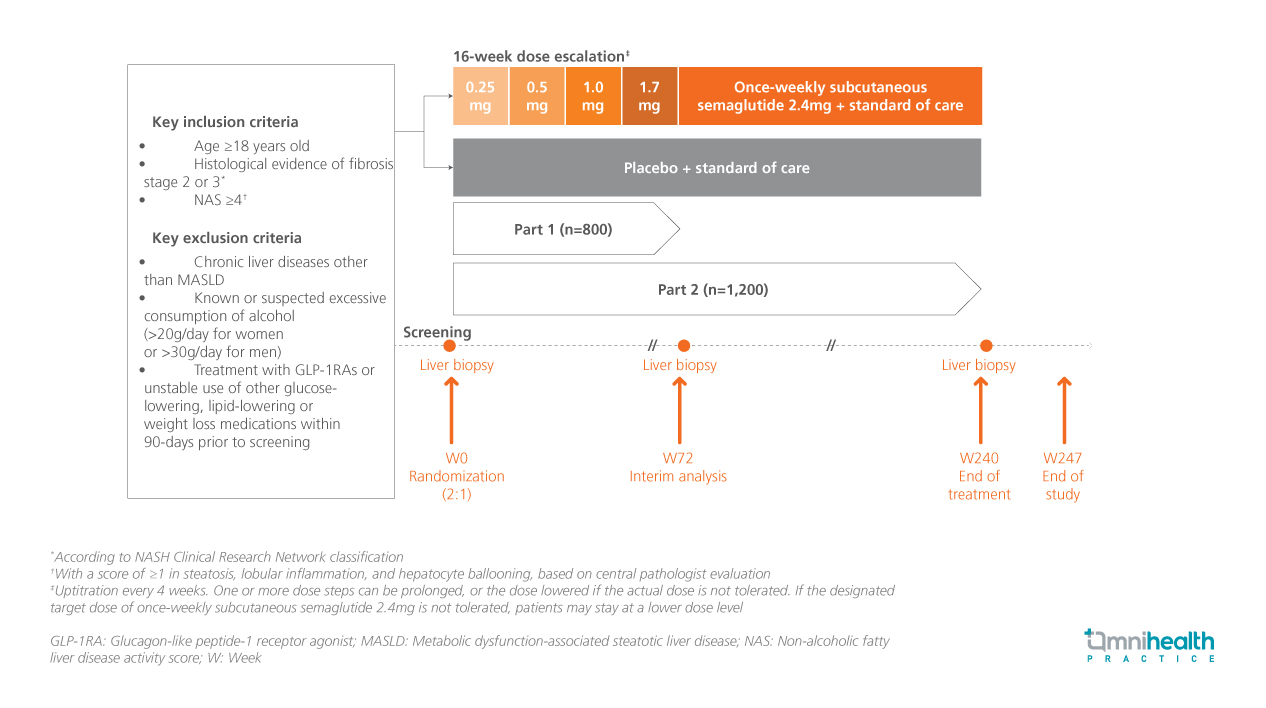 The ESSENCE trial is an ongoing, randomized, double-blind, placebo-controlled, phase 3 study assessing the efficacy and safety of once-weekly subcutaneous semaglutide 2.4mg in patients with biopsy-confirmed MASH and fibrosis stages 2-3.1 In part 1 of the study (0-72 weeks), participants (n=800) were randomized 2:1 to receive semaglutide (n=534) or placebo (n=266) along with standard of care.1 The primary analysis was conducted on the intention-to-treat (ITT) population after 72 weeks.1 The primary endpoints of part 1 of the study included steatohepatitis resolution without worsening of liver fibrosis and liver fibrosis improvement without worsening of steatohepatitis.1 Confirmatory secondary endpoints were change in body weight, resolution of steatohepatitis with improvement in liver fibrosis, and improvement in SF-36 bodily pain.1