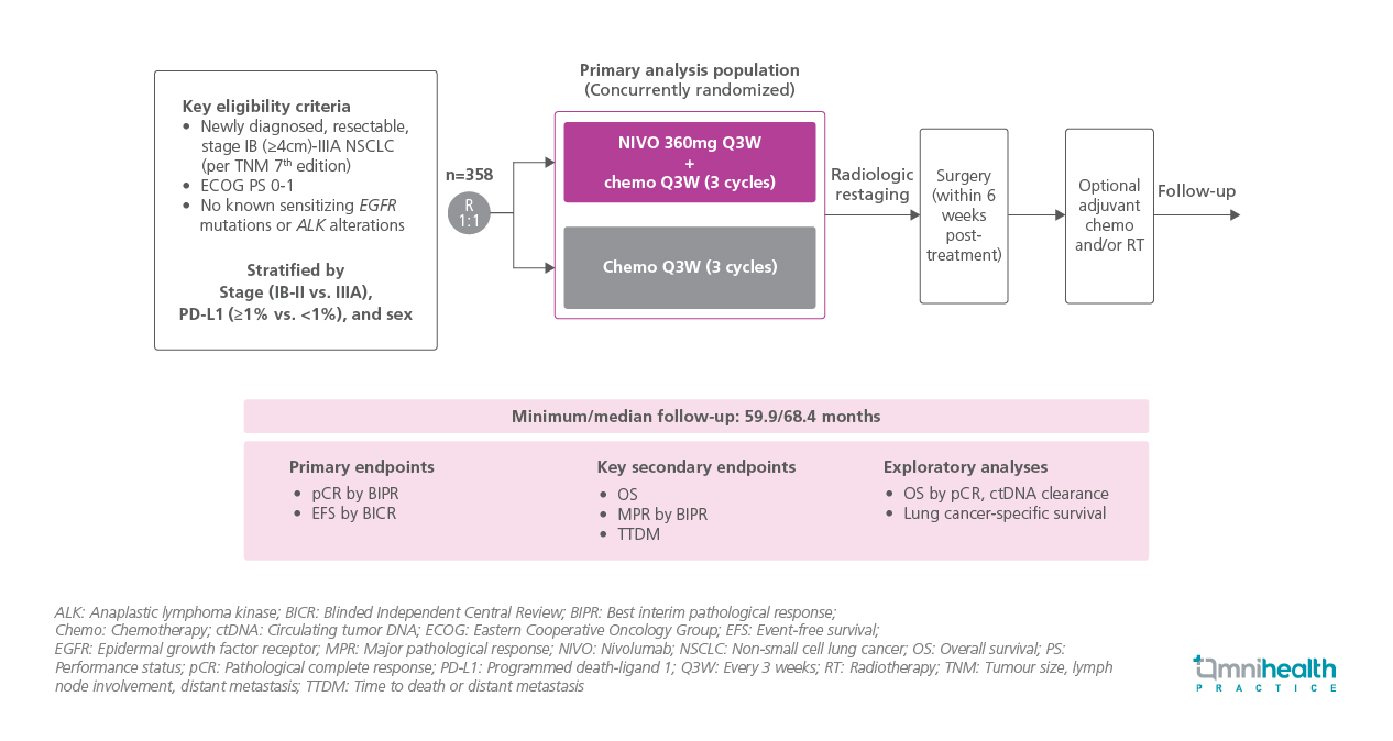 Participants were randomized 1:1 to receive neoadjuvant nivolumab 360mg + chemotherapy (n=179) or chemotherapy alone (n=179), administered every 3 weeks for 3 cycles prior to surgery.1 Surgical resection was planned to occur within 6 weeks after completion of neoadjuvant therapy.1 Postoperative adjuvant chemotherapy, radiotherapy, or both were permitted.1