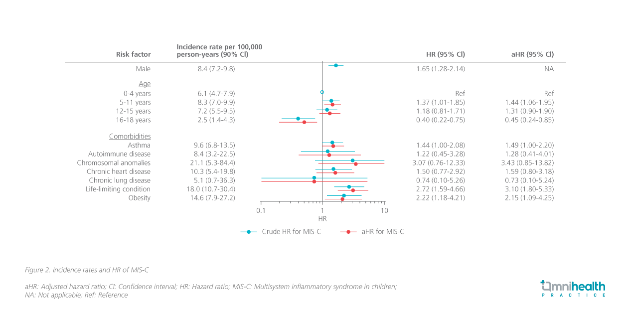 A large Swedish cohort study was performed to assess the risk factors of MIS-C for identifying vulnerable children.1 This study involved 2,117,443 children with comorbidities, including asthma, autoimmune disease, chromosomal anomalies, chronic heart disease, chronic lung disease, obesity, and other life-limiting conditions.1 A total of 253 children developed MIS-C, corresponding to an incidence rate of 6.8 per 100,000 person-years (95% CI: 6.0-7.6).1 Results found that children aged 5-11 years were 44% more likely to develop MIS-C vs. children aged 0-4 years [adjusted HR(aHR)=1.44; 95% CI: 1.06-1.95].1 In addition, the male sex was also associated with a 65% elevated risk of MIS-C vs. female (HR=1.65; 95% CI: 1.28-2.14).1 Children with asthma (aHR=1.49; 95% CI: 1.00-2.20), obesity (aHR=2.15; 95% CI: 1.09-4.25), or a life-limiting condition (aHR=3.10; 95% CI: 1.80-4.25) were also found to be more susceptible to MIS-C (figure 2).1 Dr. Cheung reminded that parents should be more alert when high-risk children develop early symptoms and should seek medical attention accordingly.