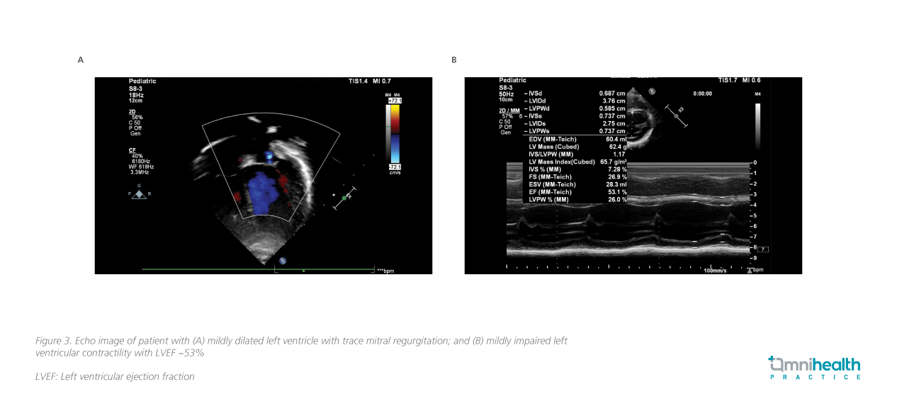 In September 2022, a 7-year-old girl presented with recurrent fever, rash, conjunctivitis, and abdominal discomfort 5 weeks after recovering from COVID-19. Since public awareness of MIS-C has increased, the girl’s parents promptly sought medical attention when the symptoms were still mild. Upon initial medical evaluation, biochemistry showed an elevated level of CRP of 75.5mg/L. The erythrocyte sedimentation rate (ESR) was 48mm/hour at presentation. The patient was also found to have increased levels of ferritin, N-terminal-pro B-type natriuretic peptide (NT-proBNP) and D-dimer, but with a low platelet count. Initial echocardiogram showed mildly impaired left ventricular contraction but normal coronary arteries (figure 3). The diagnosis of MIS-C was confirmed.