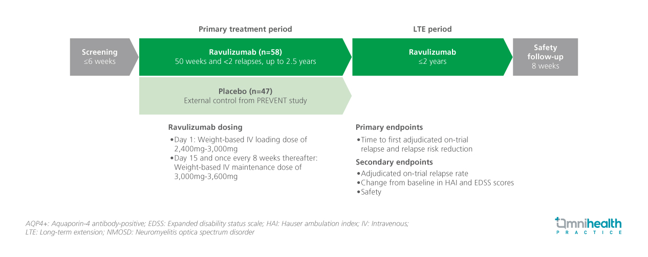 The CHAMPION-NMOSD trial is an ongoing, global, open-label, phase 3 study evaluating ravulizumab in patients with AQP4+ NMOSD.1 A total of 58 patients were enrolled in the primary treatment period (PTP), with 56 patients entering the long-term extension (LTE) phase as of the data cutoff on June 14, 2024.1 Adult participants in PTP received an intravenous weight-based loading dose of ravulizumab on day 1, followed by maintenance doses starting on day 15 and every 8 weeks thereafter.1 The placebo arm (n=47) of the PREVENT study, which evaluated eculizumab in patients with AQP4+ NMOSD, was used as an external control group.1 After completing the PTP for up to 2.5 years, patients were eligible to enter the LTE phase.1 Baseline demographics and clinical characteristics were generally similar between the ravulizumab group in CHAMPION-NMOSD and those in the placebo group from the PREVENT study.1