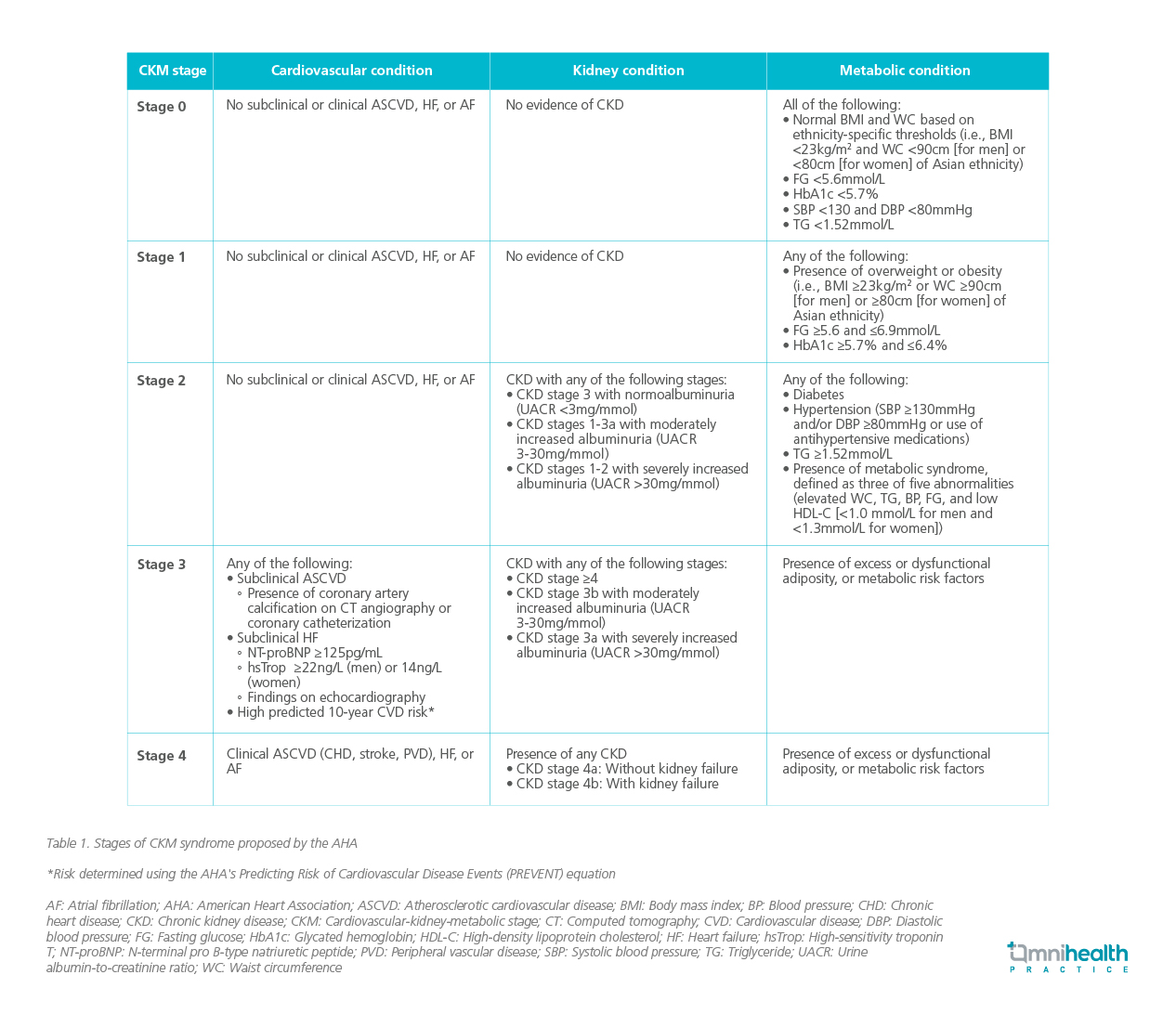 The CKM syndrome is a multi-system entity characterized by the interconnected progression of atherosclerotic cardiovascular disease (ASCVD), atrial fibrillation (AF), heart failure (HF), chronic kidney disease (CKD), excess adiposity, metabolic syndrome, and diabetes mellitus (DM) (table 1).2 The American Heart Association (AHA) coined the term in response to the emergence of two new medication classes—sodium-glucose cotransporter 2 (SGLT2) inhibitors and glucagon-like peptide-1 (GLP-1) receptor agonists—that have overlapping indications for preventing and treating diabetes, CKD, and heart disease.2 CKM conditions often coexist and exacerbate each other, highlighting the urgent need for a more integrated approach to care.3 By recognizing CKM syndrome as a comprehensive, multi-system disease, the framework promotes early detection, holistic treatment strategies, and improved long-term outcomes.2