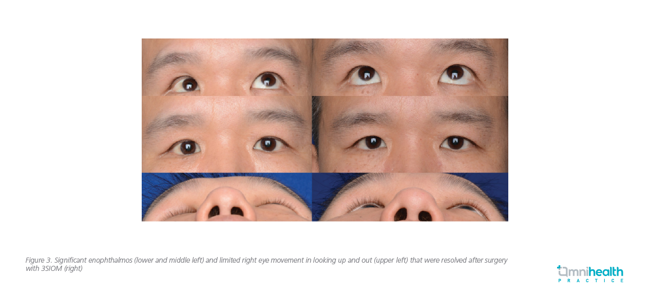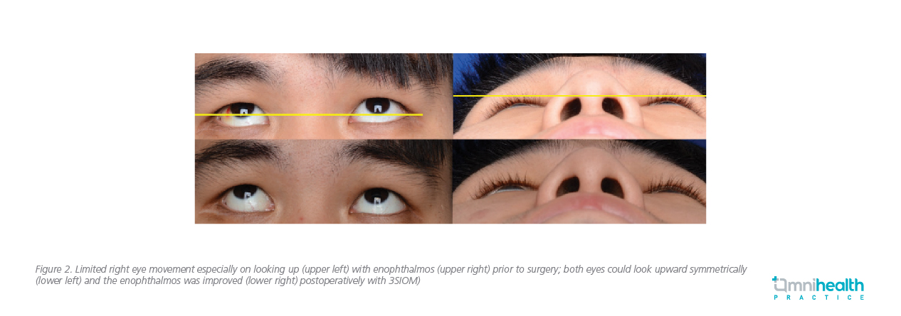 In this case review, 2 local patient cases were shared to illustrate the benefits of 3SIOM. The first patient was a 26-year-old male with good medical and ocular health who had sustained right eye blunt trauma by opponent’s elbow during a handball game in December 2017. CT scans of his orbits showed large blowout fracture of the right eye orbital floor and part of the medial wall. Apart from severe periorbital swelling, he had limited right eye movement especially on looking up and out, and he suffered from primary and down-gaze diplopia as well as infraorbital numbness. He received 3SIOM-assisted orbital fracture repair and insertion of implant in January 2018. He had good postoperative recovery with improvement of double vision and eye movement with some residual facial numbness (Figure 2). Postoperative CT scan done in November 2018 showed satisfactory repair of the orbital fracture with prolapsed orbital soft tissue repositioned. Dynamic MRI revealed improved vertical and horizontal movement of the right eye.