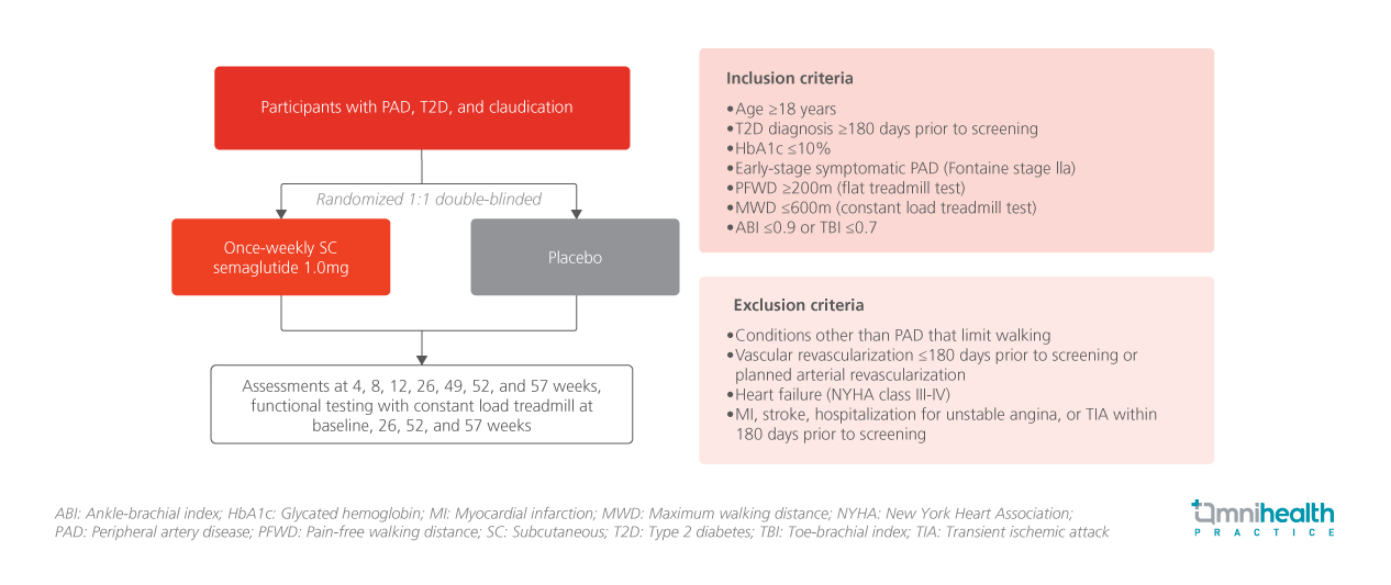 Semaglutide is a GLP-1RA approved for glycemic control in patients with T2D.1 In the phase 3b, double-blind, randomized, placebo-controlled STRIDE trial, the effect of once-weekly semaglutide on functional walking capacity, quality of life (QoL), and clinical outcomes in adults with T2D and PAD were evaluated.1 The trial enrolled 792 participants across 112 sites in 20 countries.1 Eligible patients had a diagnosis of T2D with HbA1c ≤10% and early-stage symptomatic PAD classified as Fontaine stage IIa, with a maximum walking distance (MWD) ≤600 meters on a constant load treadmill and pain-free walking distance (PFWD) ≥200 meters on the flat treadmill.1