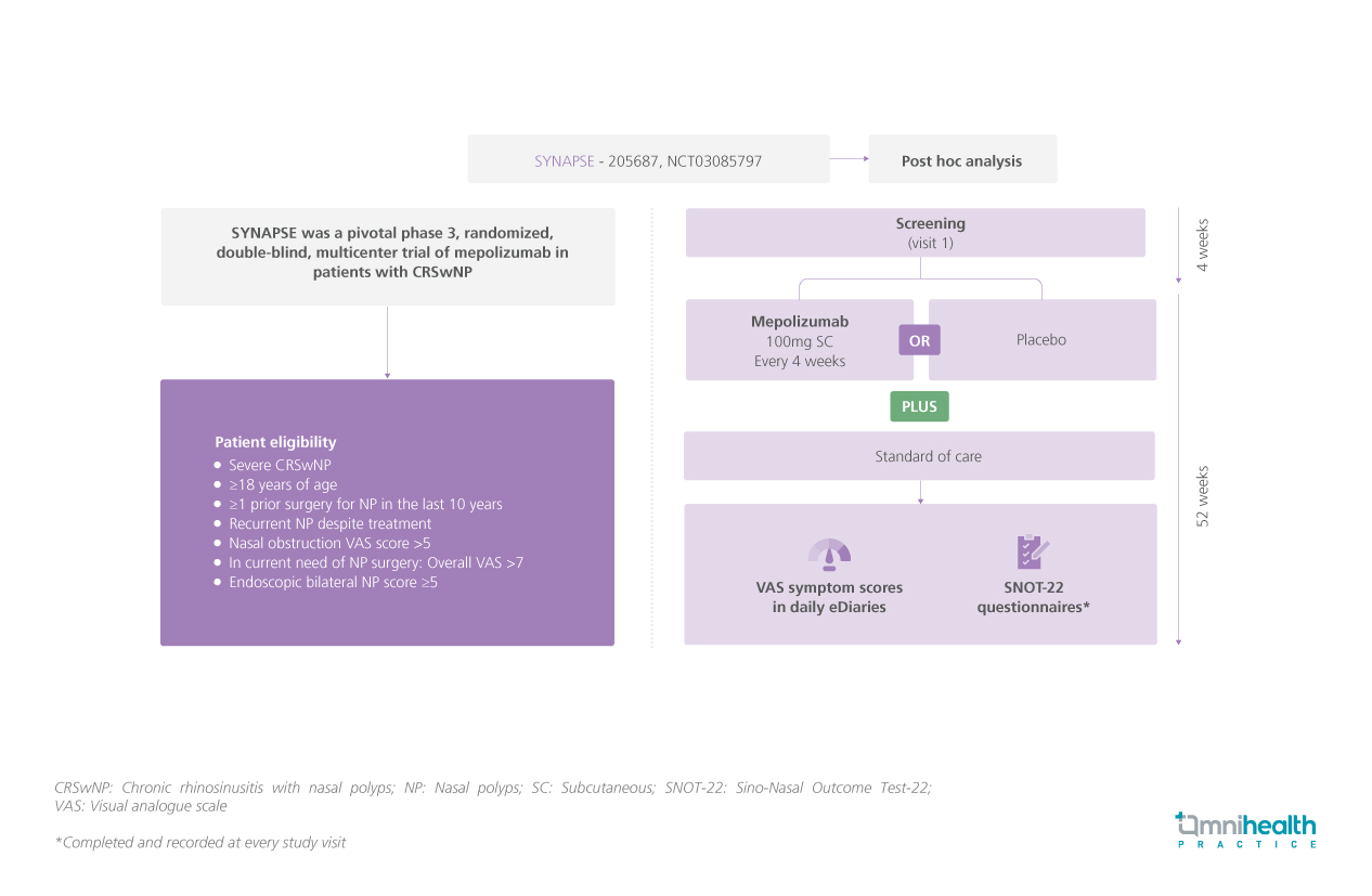 SYNAPSE study was a phase 3, randomized, double-blind, multicenter trial conducted to examine the impact of mepolizumab on symptom reduction and improvements in quality of life (QoL) among patients with CRSwNP.1 Adult patients with severe CRSwNP, and had at least 1 prior surgery for nasal polyps (NP) with recurrent nasal polyps despite treatment with an endoscopic bilateral NP score ≥5.1 They also scored >7 for the current need for NP surgery and >5 for nasal obstruction on a visual analogue scale (VAS).1 They were randomized to receive mepolizumab (n=206) or placebo (n=201) plus standard of care for 52 weeks.1