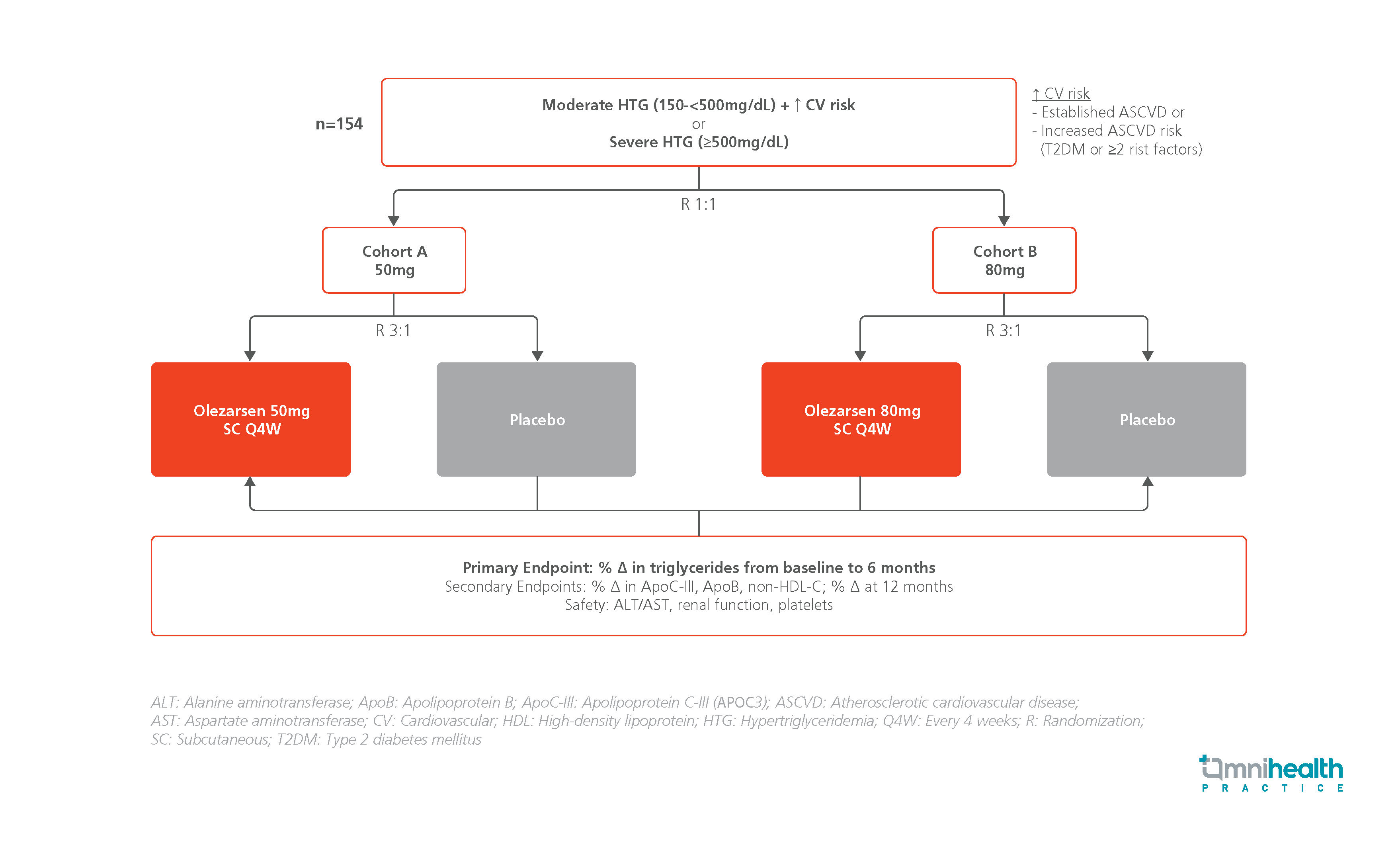 The BRIDGE-TIMI 73a study is a phase 3 trial which evaluated the efficacy and safety of olezarsen in patients with moderate hypertriglyceridemia (HTG) and elevated CV risk or with severe HTG.1 The study included 154 patients with TG levels between 150mg/dL and <500mg/dL with a high CV risk or with TG levels ≥500mg/dL.1 A high CV risk was defined as the presence of established atherosclerotic CV disease (ASCVD) or increased ASCVD risk (presence of type 2 diabetes mellitus [T2DM] or ≥2 risk factors).1 They were randomized 1:1 into 2 cohorts, each receiving a different dose of olezarsen.1 Patients in cohort A were further randomized 3:1 to receive olezarsen 50mg subcutaneously (SC) every 4 weeks (Q4W) or placebo.1 Similarly, patients in cohort B were randomized (3:1) to receive olezarsen 80mg SC Q4W or placebo.1
